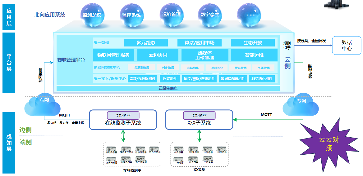 针对水电业务特点和需求,基于拾贝云核心技术底座,结合云、边、端侧的技术平台产品、应用产品、智能硬件产品,构建工业企业云边端协同的智慧系统,实现了工业系统的智感知、智学习、智决策、智执行、智适应